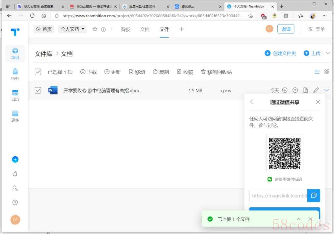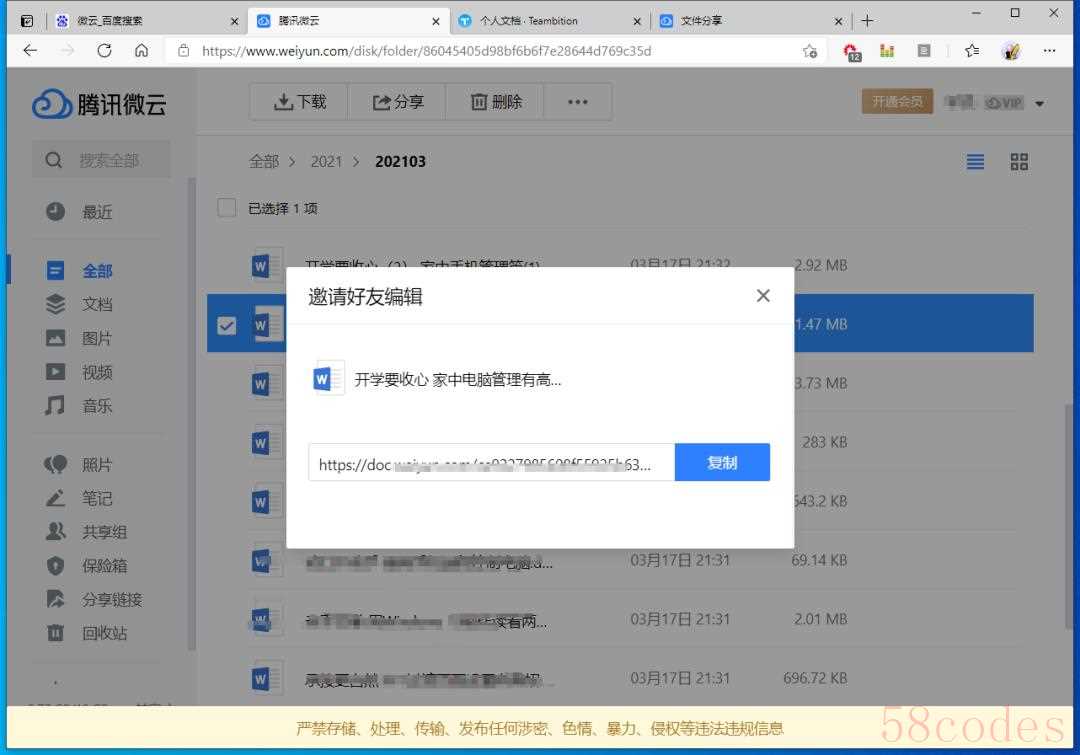 百度网盘的共享操作类似,打开网盘后选择需要共享的文件,点击其后的链接即可生成共享链接,不同的是它可以设置访问密码。华为云有主要针对手机文件,并没有提供共享功能。因此在这一环节的体验中,Onedrive的共享功能最好用,阿里云次之,对于经常使用手机的用户则建议使用微云,因为它和QQ、TIM可以无缝融合。