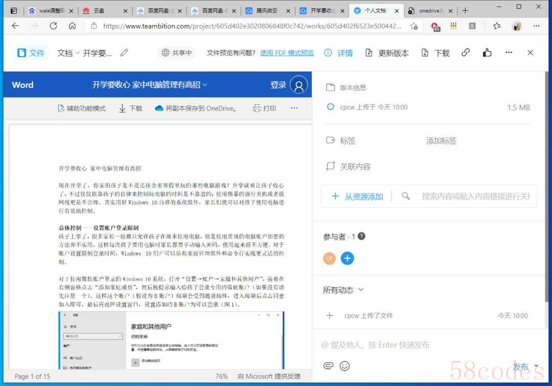 阿里云盘和微云则是通过调用在线Office来预览和编辑在线文档的,因此操作大同小异,只是阿里云盘在页面增加了添加标签、协作者动态、文档交流在线工具等更多功能,更方便有移动办公需求的用户使用(图8)。