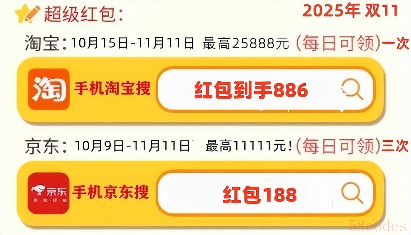 - 红包口令与满减规则京东红包:搜索「红包188」每天领 3 次,最高 11111 元;叠加每满 300 减 50、PLUS 会员 5000 减 1000 超级券。淘宝红包:搜索「红包到手886」每天领 1 次,最高 25888 元;全程 “百亿补贴” 返场,家电数码 5 折起。叠加顺序:国补→官方直降→跨店满减→平台红包→地方消费券。