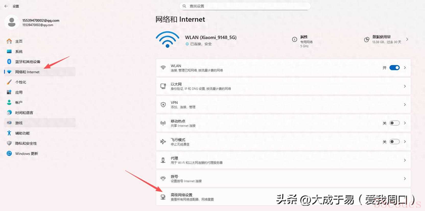 1,打开高级网络设置。打开设置,选择网络和Internet,选择高级网络设置,
