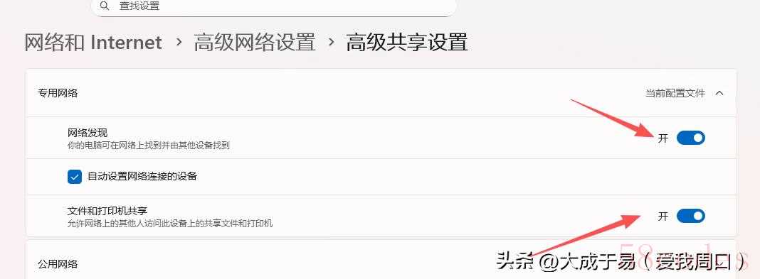 2,进行高级网络设置。开启网络发现和文件和打印机共享。