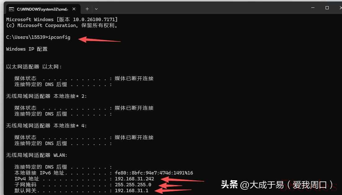 7,查看本机和另一台电脑IP地址,方法为WIN+R,输入cmd,然后输入ipconfig,可以查看 本机的IP地址、主机地址以及子网掩码。