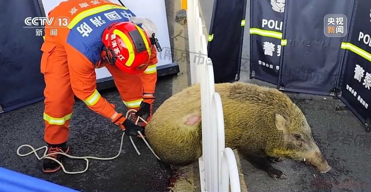 频繁出现在城市的野猪,让相关的救助也多了起来。11月21日清晨,一头野猪在横穿马路时不幸被卡在了路中央的护栏中,接到报警赶来的消防队员和交警,先布设了围挡,固定了野猪的四肢和嘴部,再帮助野猪脱困。现在在南京,已经形成了一套成熟的联动机制。