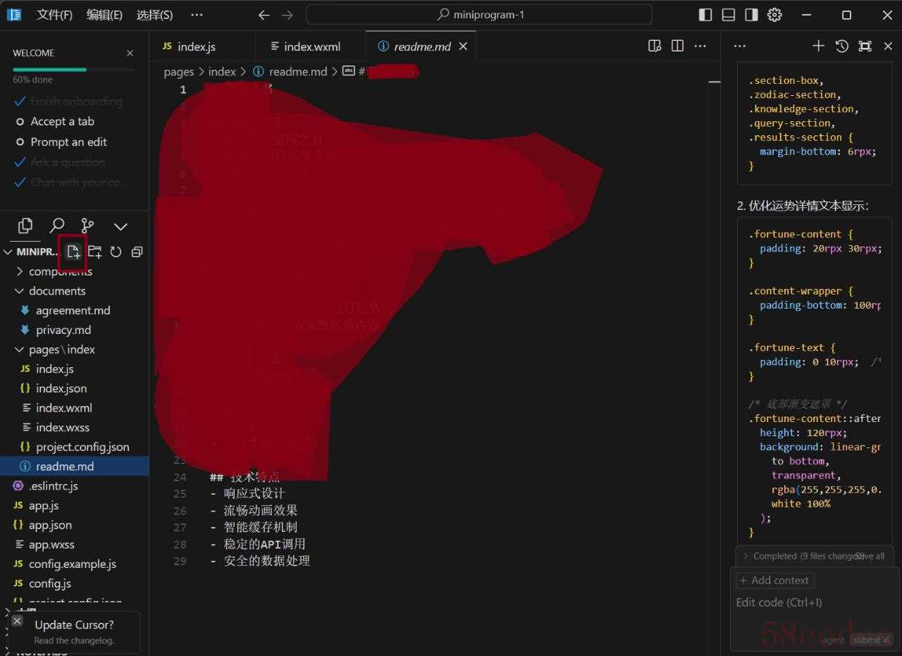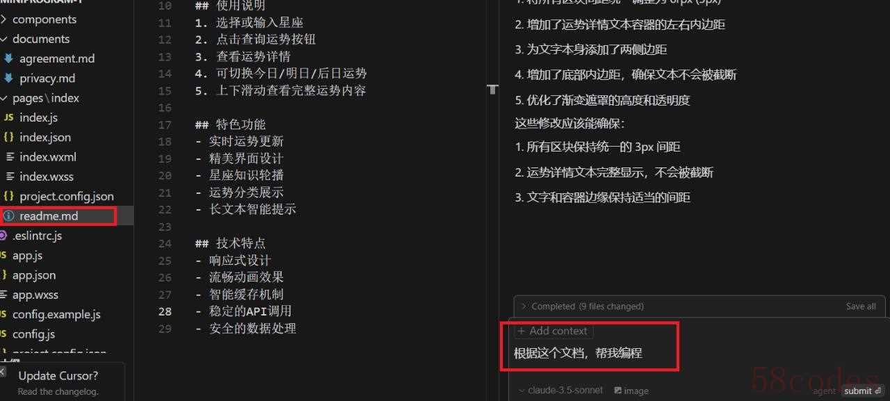 接着在Feature里将画框的部分打开,第一个选择“Enable”之后AI助手自动操作,不需要人工再进行操作写代码(除非你做审查),第二个是自动纠错功能,其余保持初始状态即可。3、开始编写将第一步在微信开发助手里新建的本地文档导入,接着新建一个readme.md文档。