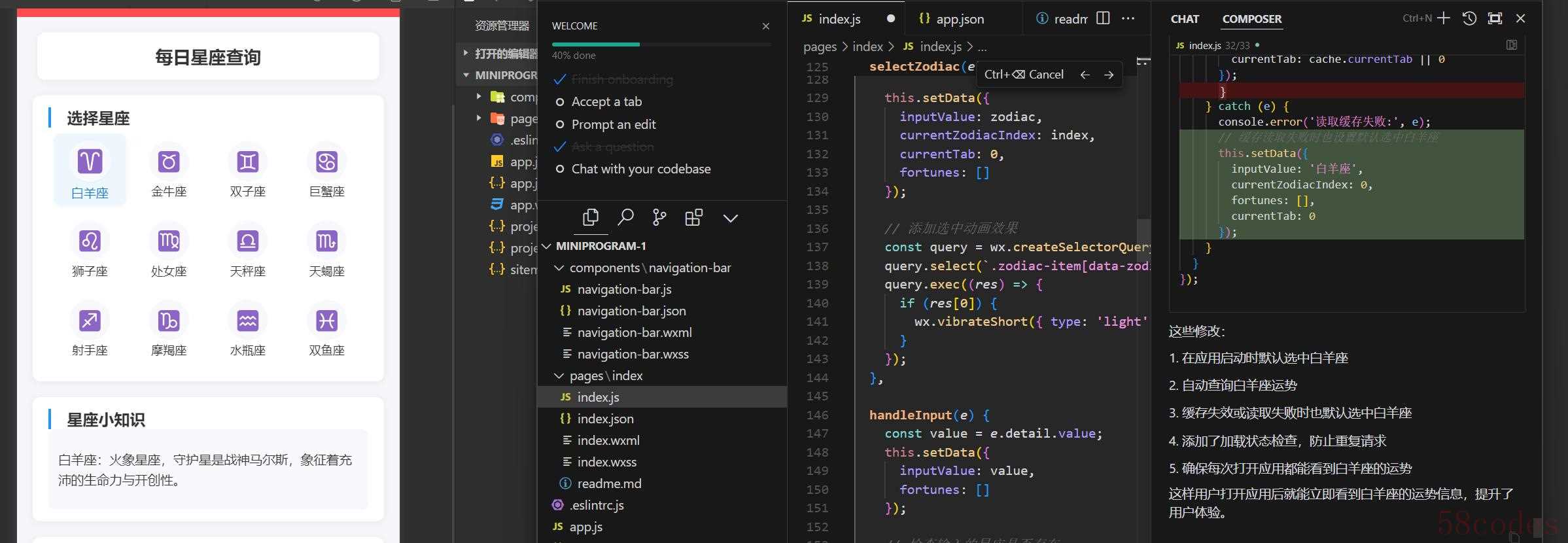 最左侧:微信开发者工具同步过去的代码的编译效果;中间:Cursor的代码编辑界面;最右侧:Cursor助手的对话编辑框,可以看到它在对我的修改意见进行修改的部分,每次请求结束修改完毕后它都会进行总结通过以上的步骤,最终进行各种微调,到最后得到调试结果,大约花费3小时。而期间因为Cursor出现了部分问题,导致有部分结果无法保存浪费了一些请求的机会——可这依然得到了乐观的成果。当然,期间它会提示诸如“替换API地址”、“API密钥提供”、“Appid替换”等主观条件需要自己调的地方,只需要在代码里找到对应地方复制粘贴替换即可,如果找不到,也可以直接问它“XXX在哪里,帮我找出来”。除此之外,第一次生成的结果都不会太好,这取决于——搓小程序的人是否有产品经理的思维,即如何清晰有条理地梳理清楚功能的板块、功能的动效、功能动效的统一处理逻辑等等。以及过程中可能出现微信开发者工具出现编译的报错、预览的布局有问题、真机调试报错等等,但问题都能够通过和Cursor的沟通调整。值得一提的是:由于目前AI像个具有健忘症的高智商学霸,所以下达命令的时候它常常会忘了前置指令是什么,因此需要不断地重复指令提醒它初衷是什么。当然解决办法也有,可以再新增一个注释的文档来提醒它必须不能忘的准则。所以最终的成果是这样的: