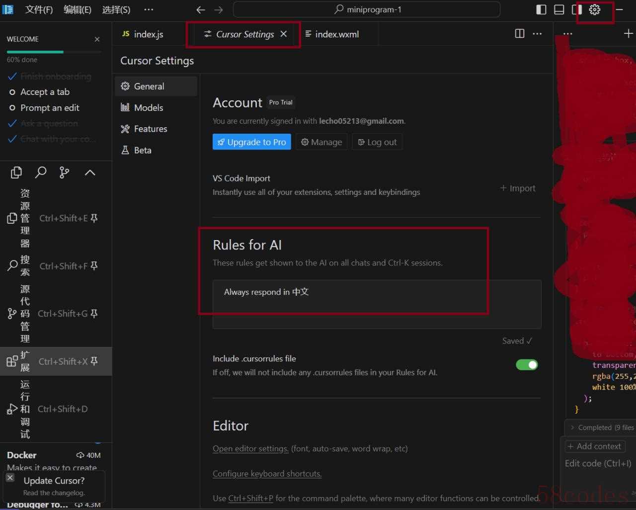 接着点击右上角的设置符号,调出Cursor的设置界面(首次进入会有一系列的填写或选择,如果没设置好可以到右上角上重新调出,我这是有设置了,所以直接展示界面)。Cursor好的地方在于,它可以用中文来进行提问和以中文回复,上文的“Rules for AI”的“Always respond in 中文”就是这个设置,除此之外也支持日文和英文。