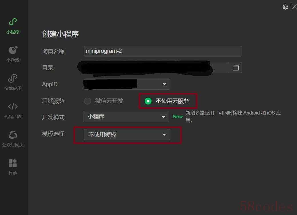 最后,记住API的地址:https://api.siliconflow.cn/v1/chat/,一般固定是这个,如果实在不行,去硅基流动的官方文档里查询,得到之后保存到本地就行。API需要搭配密钥一起使用,因此要记住API密钥不要泄露。至此,4步完成之后,我们可以开始正式的“编程”了。开始用Cursor编程1、新建小程序模板打开“微信开发者工具”,新建模版,如图,选“不使用云服务”、“不使用模版”,点击创建之后会创建一个本地的文件,所以目录要选自己想要放置的地方。