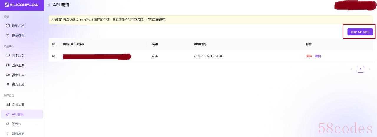 初始进入密钥是空的,选择“新建API密钥”即可,会得到一连串的信息,那就是你的大模型密钥