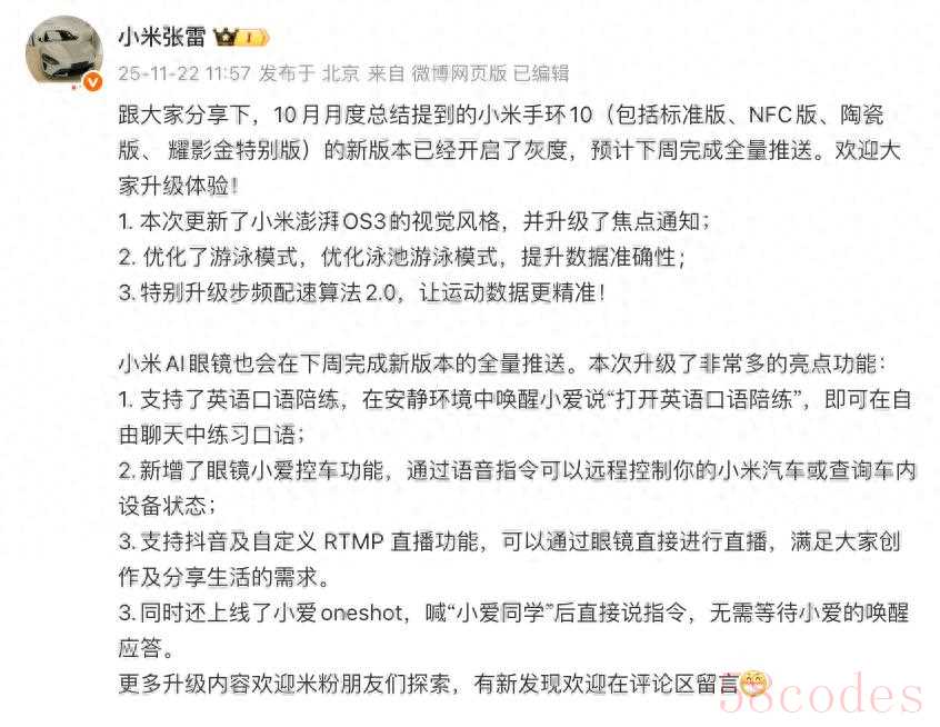 如上图所见,小米张雷表示小米手环10的新版本已经开启了灰度更新,预计下周完成全量推送(主要更新了澎湃OS3的视觉风格、升级了焦点通知,优化了游泳模式,升级步频配速算法2.0);而小米AI眼镜也会在下周完成新版本的全量推送。
