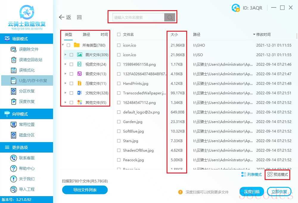 步骤3:扫描后会显示可恢复的文件列表,您可以通过软件的筛选功能进行查找,选择需要恢复的文件并预览。