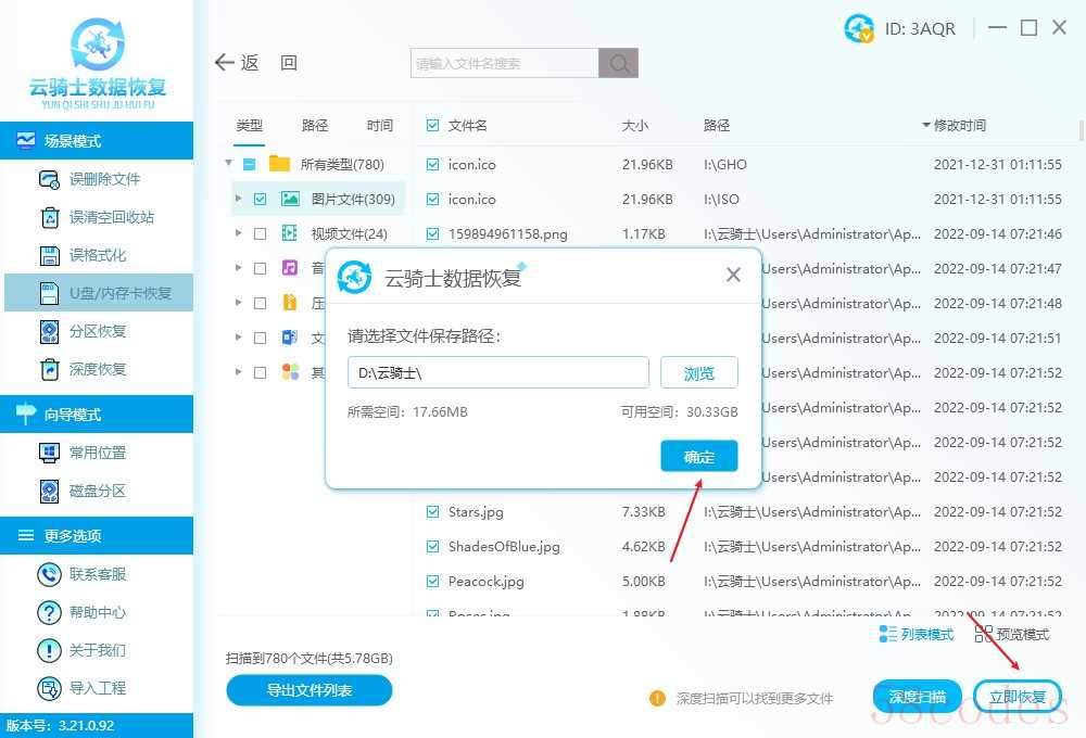 步骤4:文件能正常预览后勾选上,并点击“立即恢复”按钮,设置保存路径,即可完成数据恢复。