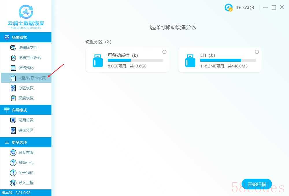 步骤2:接着打开已下载安装好的软件,选择“U盘/内存卡恢复”模式,选择SD卡进行扫描。
