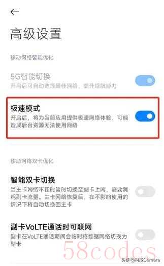 打开【设置】,选择【双卡与移动网络】,拉到最下面选择【高级设置】,打开【极速模式】即可。