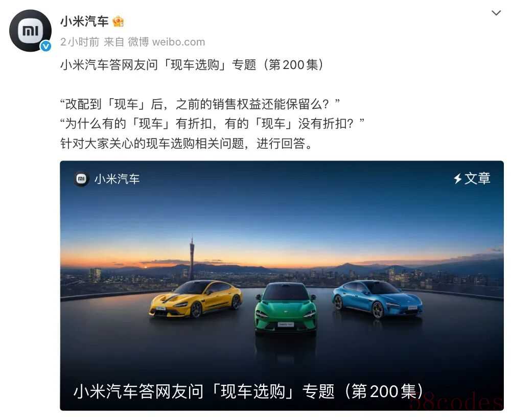 1. "小米现车选购来了":小米汽车正在提供现车购买服务,也就是说有库存车辆可以直接购买,不再需要等待太长时间的生产和交付。