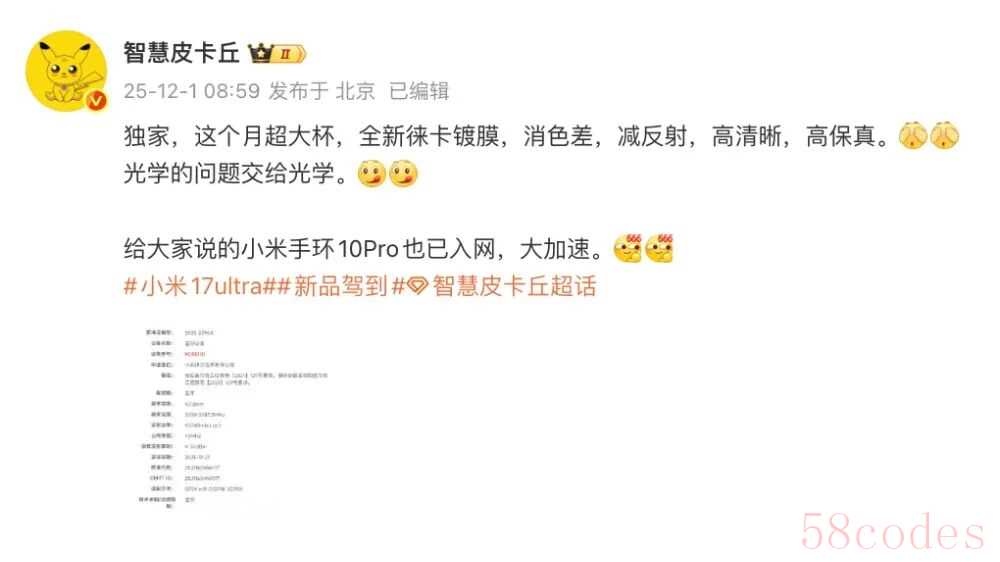 除了汽车业务外,小米手机的后续迭代产品也备受关注。今天,博主@智慧皮卡丘 的一份爆料中提到:结合其中的话题标签来看,这款本月到来的超大杯新机有可能是小米 17 Ultra,且这款新机将会继续进行影像方面的产品力提升。独家,这个月超大杯,全新徕卡镀膜,消色差,减反射,高清晰,高保真。光学的问题交给光学。