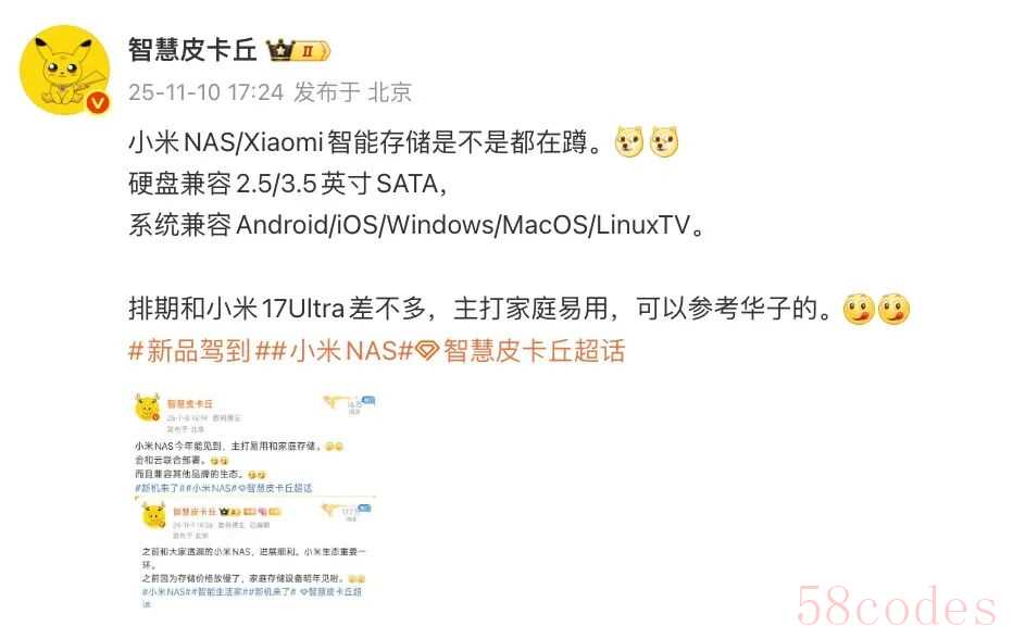 此外,小米的首款NAS有望与这次的超大杯一起上市。据爆料,小米 NAS / Xiaomi 智能存储硬盘兼容 2.5/3.5 英寸 SATA,系统兼容 Android / iOS / Windows / MacOS / LinuxTV。排期和小米 17 Ultra 差不多,主打家庭易用。
