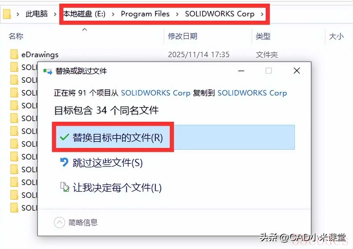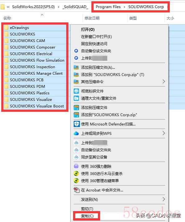 23、继续点击【SOLIDWORKS Corp】文件夹,通过Ctrl+A全选里面的文件,鼠标右键,选择【复制】。