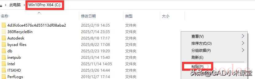 7、打开电脑C盘,在右边空白区域鼠标右键,点击【粘贴】。