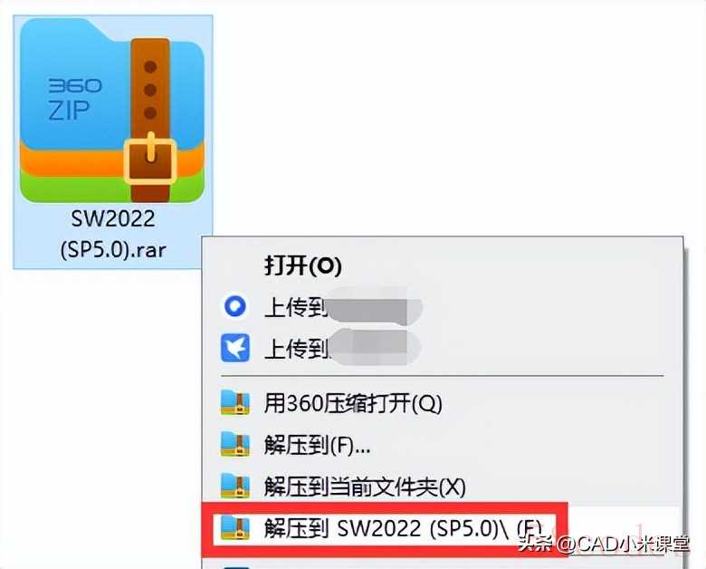 1、得到压缩包之后,鼠标右键解压,点击【解压到SW2022 (SP5.0)】。