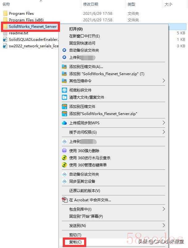6、继续找到【SolidWorks_Flexnet_Server】文件夹,鼠标右键,选择【复制】。