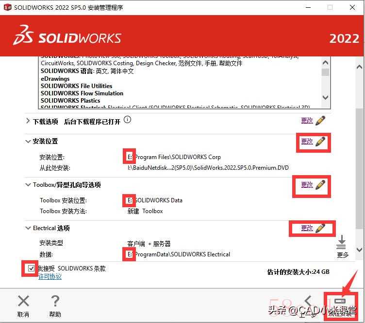 15、点击【安装位置】、【Toolbox/异型孔向导选项】、【Electrical选项】右边的【更改】按钮,将默认的C盘改成别的盘,并且记住这个地址,勾选【我接受】,然后点击【现在安装】。