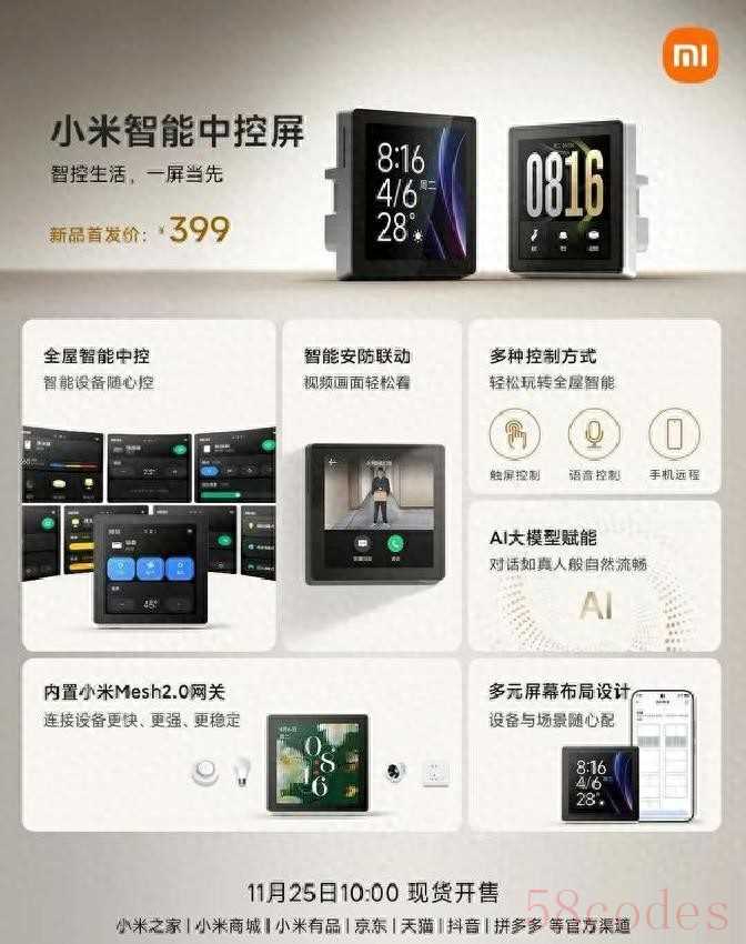 11月25日,小米把一款叫“智能中控屏标准版”的小东西上架了,现货开卖,标价399元。屏幕是3.83英寸,能直接嵌进普通86型开关底盒,有灰色和白色两种可选。小编“码上1024”第一时间摸了摸,发现它不像一块简单屏子,更像是家里一个不太起眼但又挺关键的中枢设备。