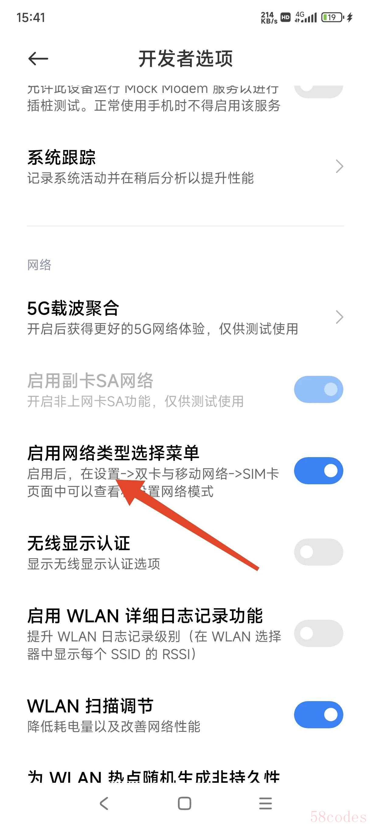 开发者选项里面找到,启用网络类型选项,把启用网络类型选项开关打开