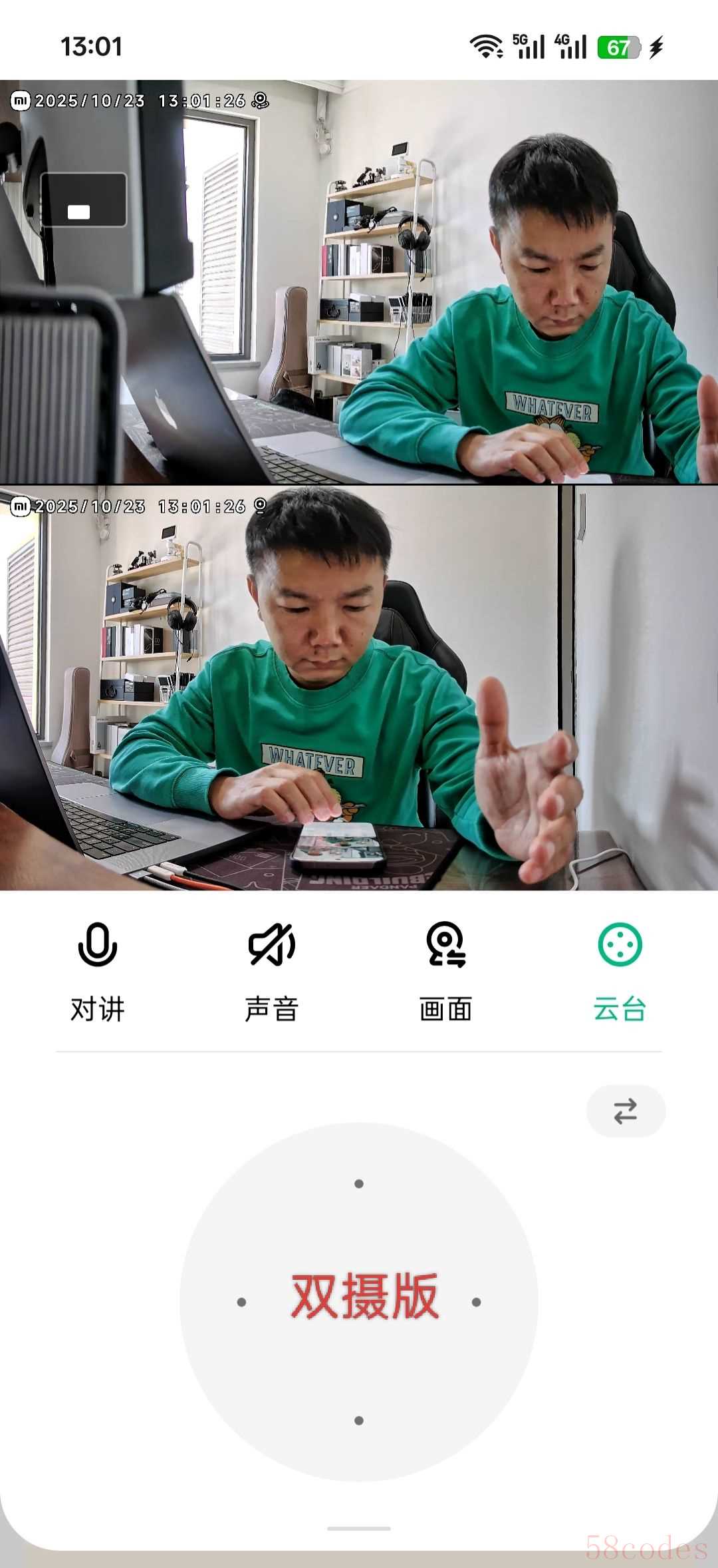 先说双摄版,上方云台摄像头、左右360度旋转、上下90度转动;下方固定摄像头拍固定视角。都是500万像素、3K超清画质,合并实现全景看护。微光场景也能全彩输出,傍晚不会频繁切换黑白画面。暗光也能用。