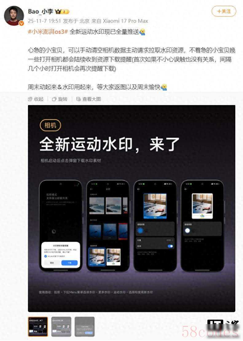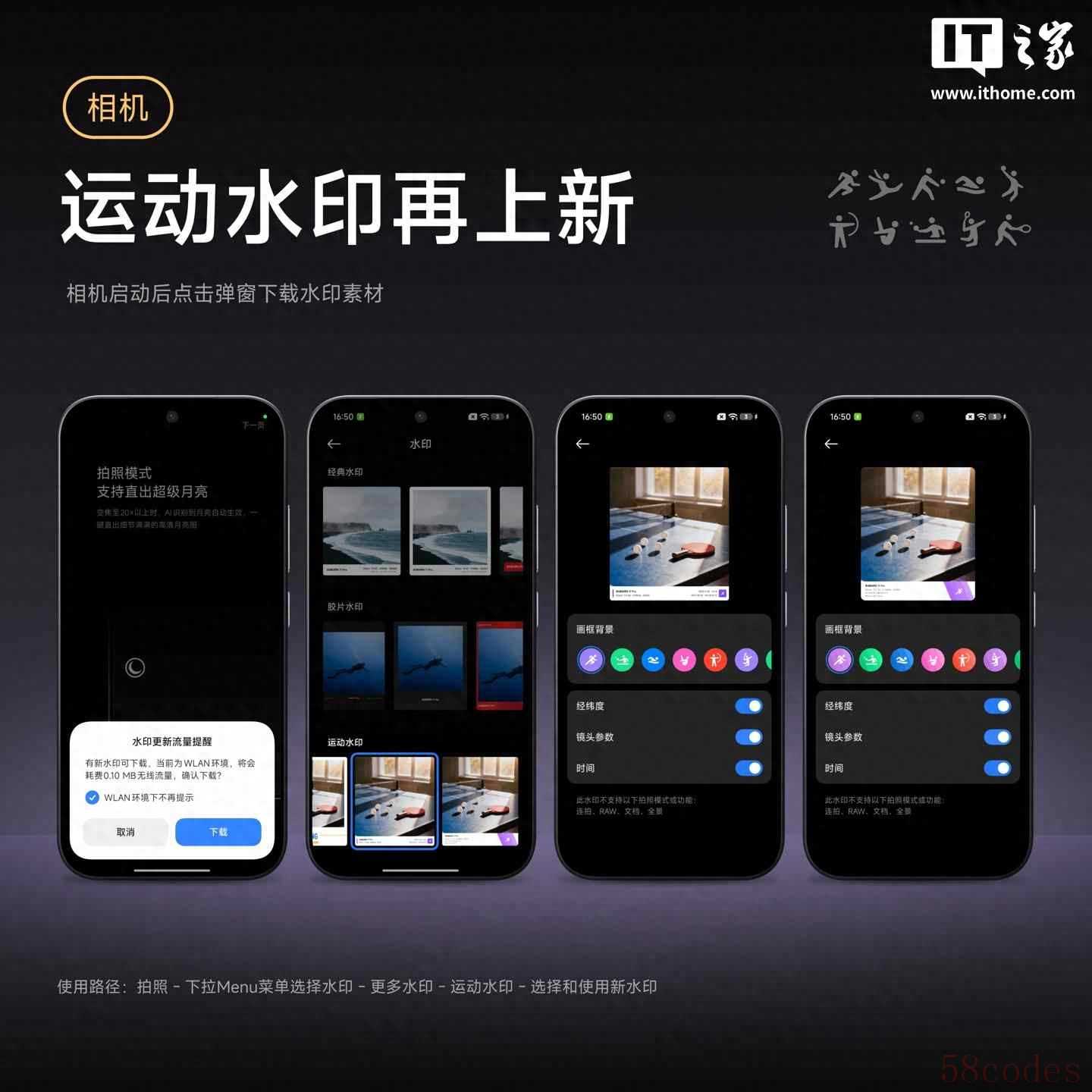 小米系统最近更新后,相机里增加了一个运动水印功能,用户在跑步、骑车或游泳时拍的照片或视频上会自动显示图标、时间、地点和相机参数,这个功能由产品经理确认,从11月7日开始向所有用户推送,用户可以自己选择模板、调整样式,也可以清除本地数据让系统重新下载。