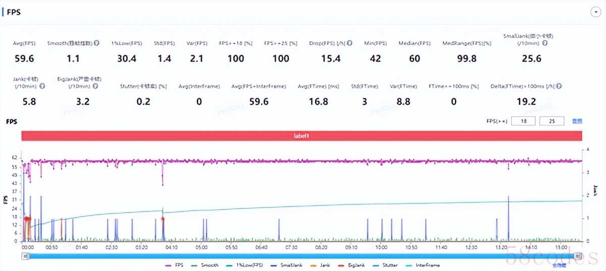 测试结果为:平均功耗59.6fps,稳帧指数1.1,1%LOW帧30.4fps。在开头刚进入游戏时有些许掉帧,应该是着色器编译导致的,编译完成后游戏运行就是几乎一条直线。