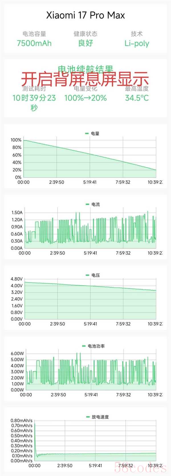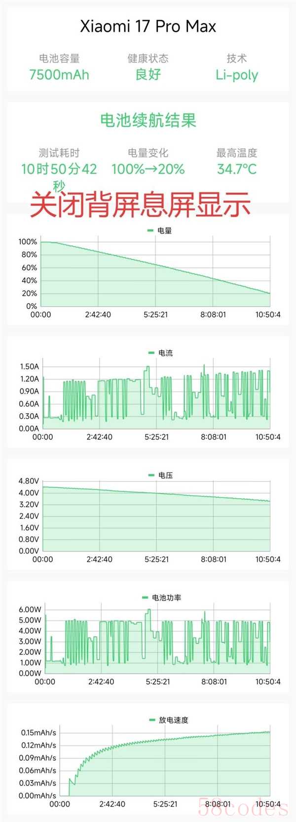 小米17 Pro Max的电池为7500mAh的小米金沙江电池,采用16%硅含量的新一代球形硅负极材料,显著的增加了电池密度。