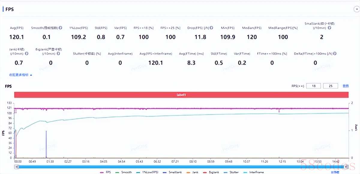 游戏平均帧数120.1fps,波动指数0.1,1%low也有109fps ,帧数这块的完美无需多言。