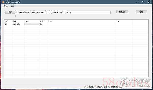 - 刷机工具下载完成后解压缩,打开XiaoMiFlash.exe将复制的内容粘贴到选择位置,当然你也可以手动点击选择指定路径。点击加载设备,刷机程序会自动识别手机(可能一开始打开的时候需要安装一些驱动,选择确定就行),点击刷机按钮开始刷机。(有BL锁机型默认会选择“全部删除并LOCK”,没有BL锁机型需要手动选择“全部删除”)