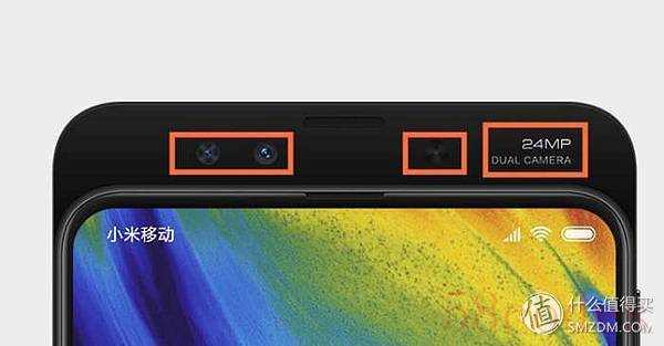 由于采用了滑轨设计,所以前置摄像头可操作余地就非常大了。小米MIX3采用滑盖全面屏设计,整机分为屏幕和主机两个部件,从图中我们可以看出,小米MIX3的前置摄像头位于主机顶部左侧,并且可以清晰的看出配置了两枚摄像头,并且在主机右侧还有一枚柔光自拍灯。另外根据主机右侧"24MP Dual Camera"字样,以及两枚摄像头规格有所不同,其中主摄为2400万像素(索尼IMX576,1.8μm),副摄应该是一枚200万像素的景深摄像头。