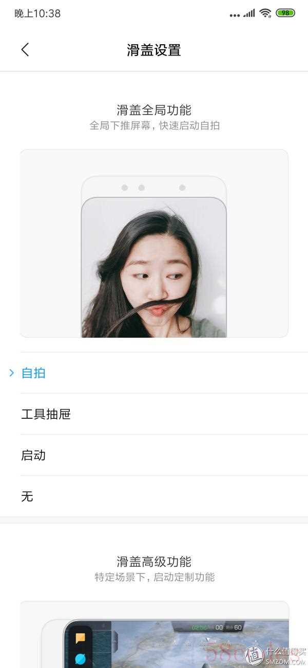 - 滑盖设置:MIX3最大的特色!没有之一,正常情况下滑开屏幕,会启动自拍,你也可以设置成工具抽屉等。