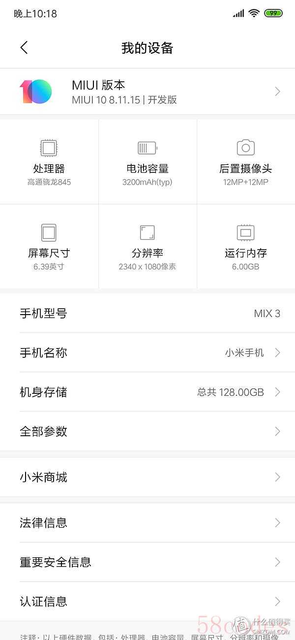这是此次我手头这部MIX3的详细参数,最低配版本,已刷机升级到MIUI10 8.11.15开发版。