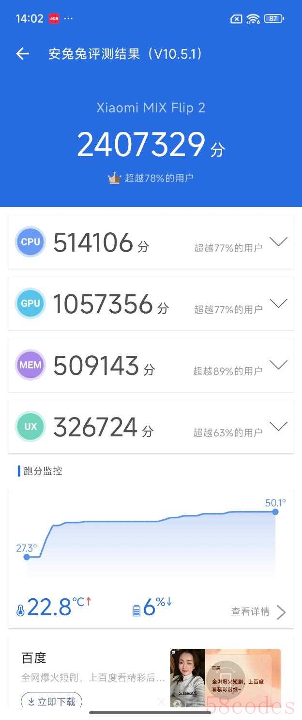 实测小米MIX Flip 2的安兔兔V10版本总分为2407329分,其中CPU为514106分,GPU为1057356分,MEM为509143分,UX为326724分。这个总分是目前骁龙8 Elite的最低分,毕竟小折叠可以理解,但是温度的提升非常明显。