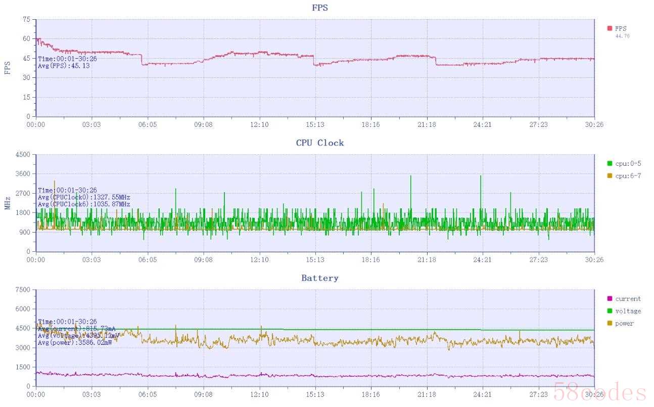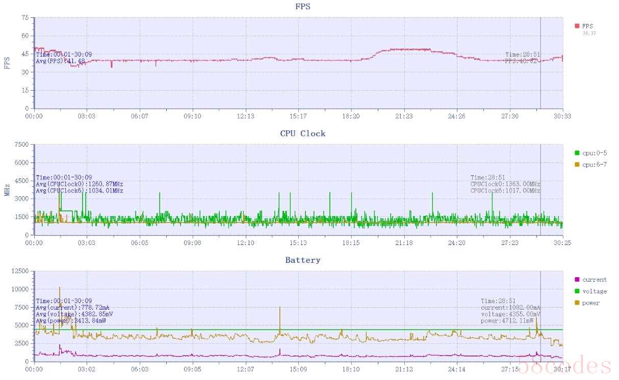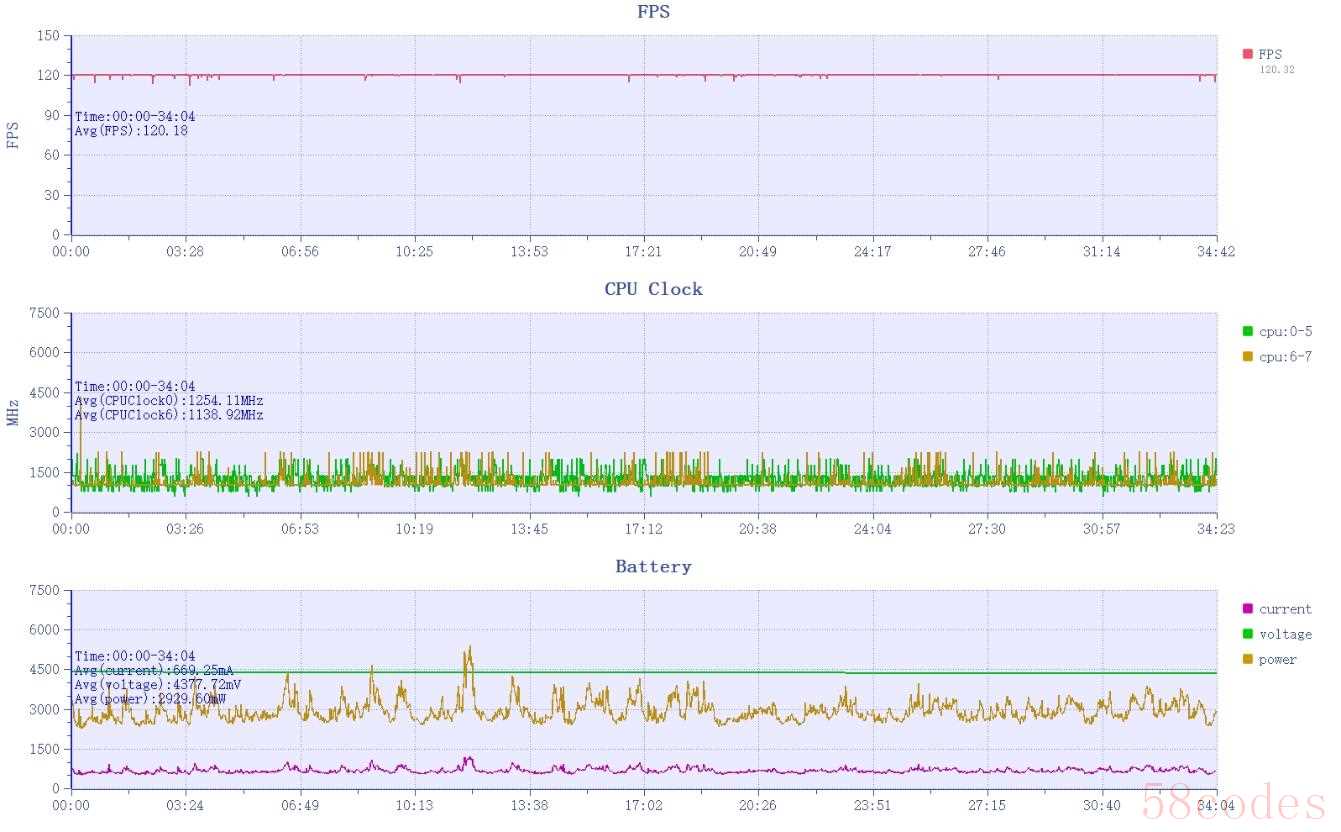 小米MIX Flip 2在30分钟王者荣耀的峡谷5v5平均帧率为120.18帧,帧率非常稳定,几乎就是一条直线,平均功耗在2.9W左右,压力并不大。