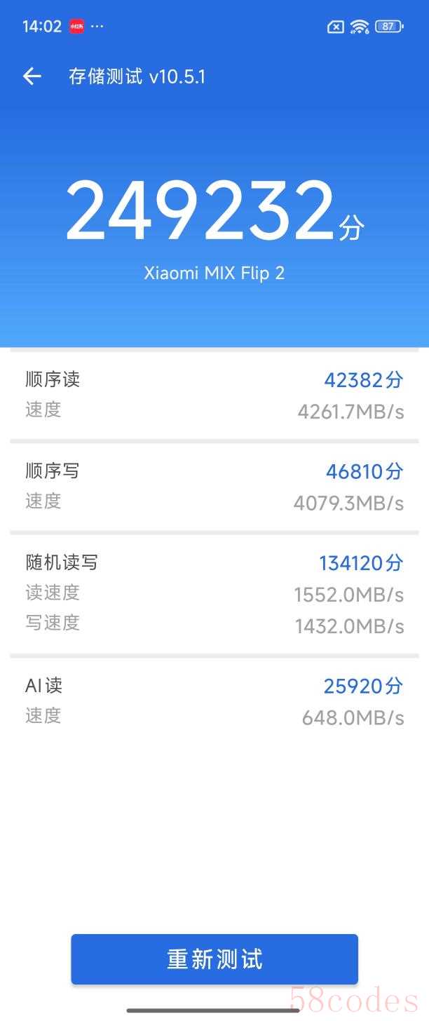 储存分数上,小米MIX Flip 2的总分为249232分,其中顺序读取为4261.7MB/s,顺序写入为4079.3MB/s,随机读取为1552MB/s,随机写入为1432MB/s,AI读取为648MB/s。