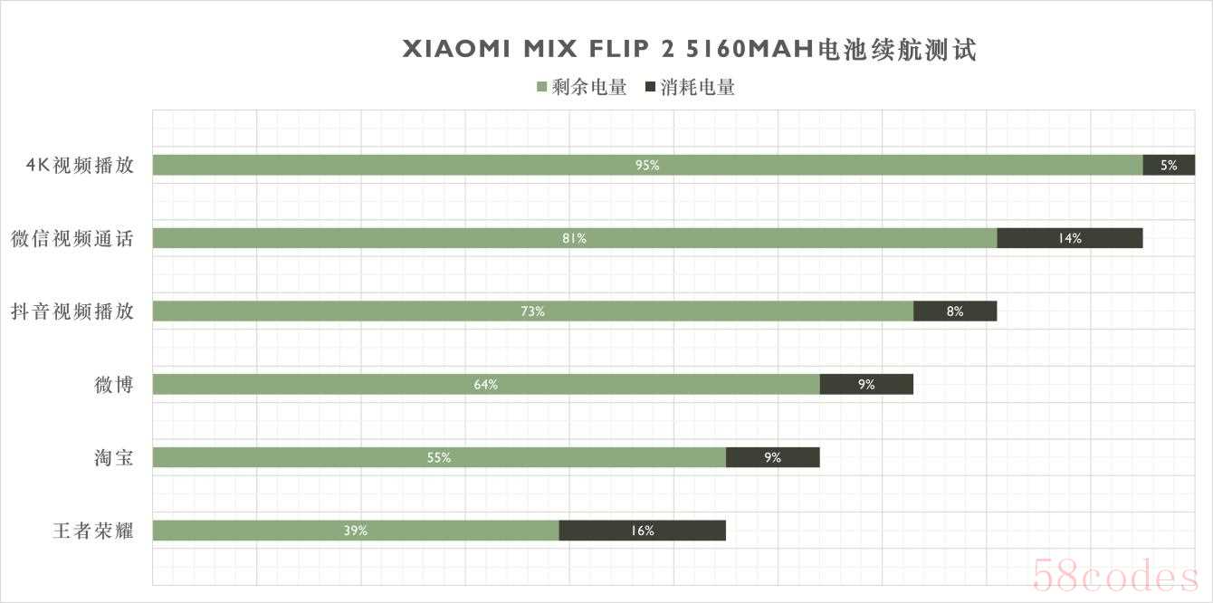在只使用内屏的情况下,我们测试了安兔兔6小时亮屏续航模型,实测小米MIX Flip 2从100%电量开始使用,1小时4K蓝光本地视频播放耗电5%,1小时微信视频通话耗电14%,1小时抖音视频播放耗电8%,1小时微博耗电9%,1小时淘宝耗电9%,1小时王者荣耀耗电16%,总计6小时亮屏使用剩余电量39%。这个成绩基本上日常使用1天1充,但剩余电量可能低于20%。