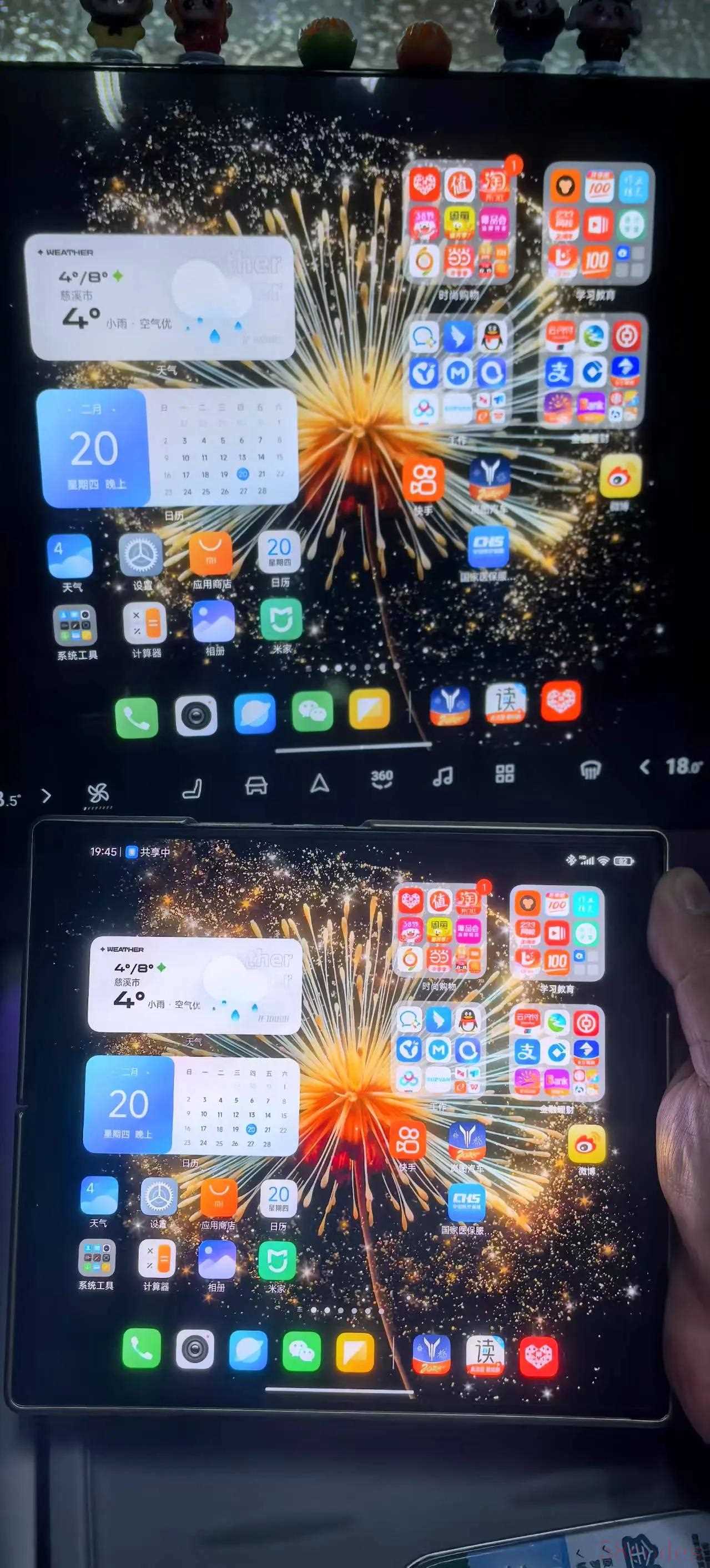 最后是一个特殊功能,就是折叠屏手机的福利。我把折叠屏一打开,哇!车机上显示的就是折叠屏打开后的画面。是不是大了很多。