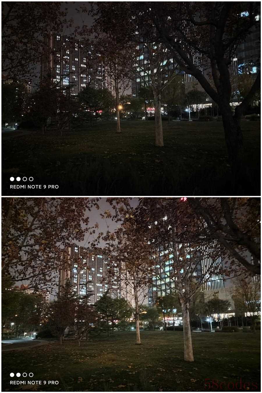 在较为极端的暗光环境下,选择夜景模式,Redmi Note 9 Pro能够获得一张细节更为丰富的照片,通过对比我们可以看到,夜景模式拍摄的照片能够很轻易的分辨出树叶的颜色以及草坪的颜色。