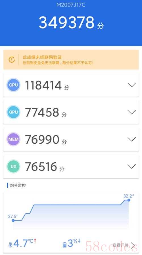 经过测试,Redmi Note 9 Pro的安兔兔性能测试的最终得分为349378分,是一款中高端性能的手机。