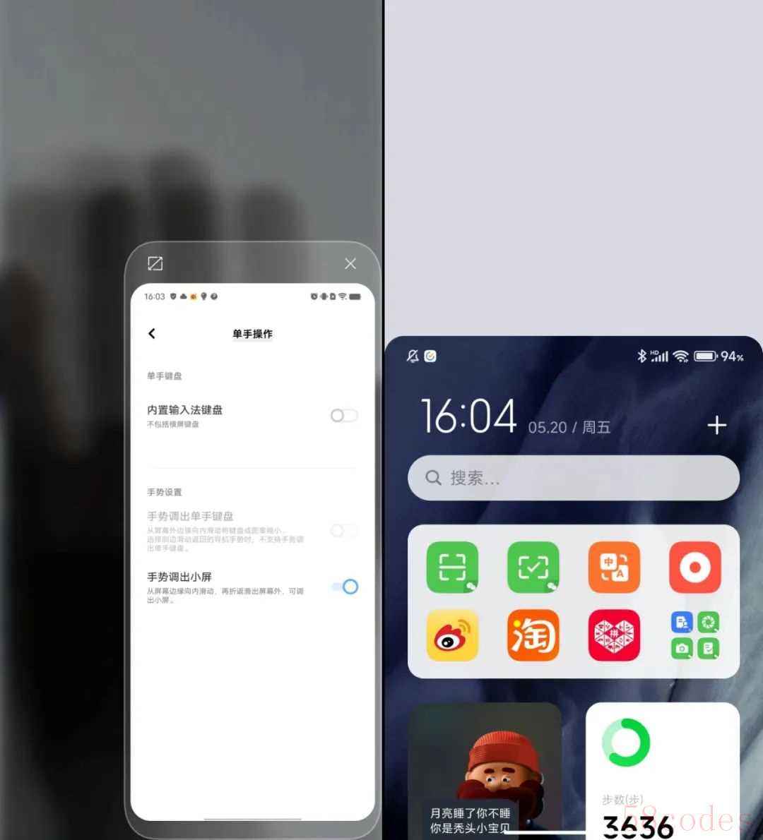 (左:OriginOS,右:MIUI)只需向下清扫小白条,整个手机界面就会下移,轻轻松松够到顶部按钮。