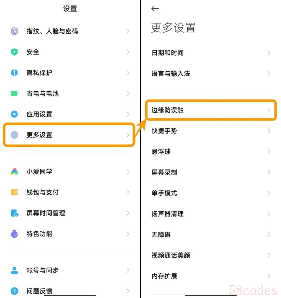 MIUI 系统设置的「更多设置」中,有一个「边缘防误触」选项,可根据需要自定义防误触区域大小。