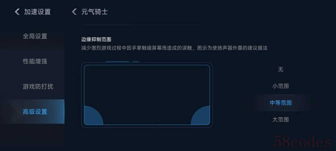打开任意一个游戏,从边缘划出游戏控制面板,然后进入「设置」-「高级设置」页面选择你要设置的游戏,里面会有「边缘抑制范围」一项。