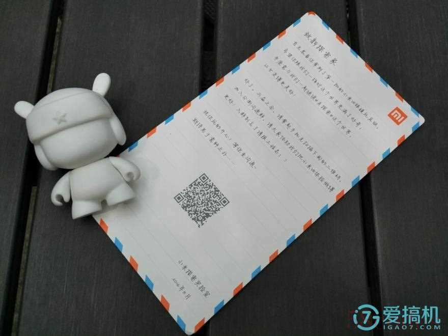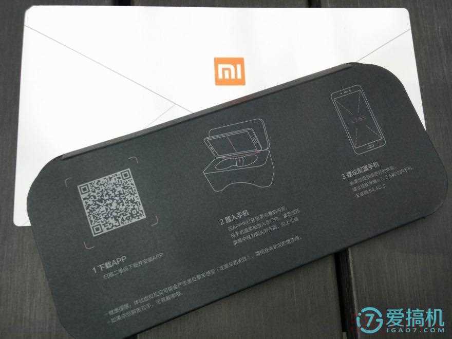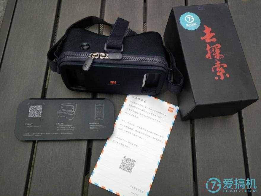 打开包装,可能是公测版独有的一封信,是小米科技写给第一批用户,内容是叫你一起进入公测沟通群,与小米VR官方人员与其他试用人员一起讨论建议与反馈。另外还有在黑色简易使用说明上,扫一下二维码可以直接安装小米VR app配合智能手机使用。