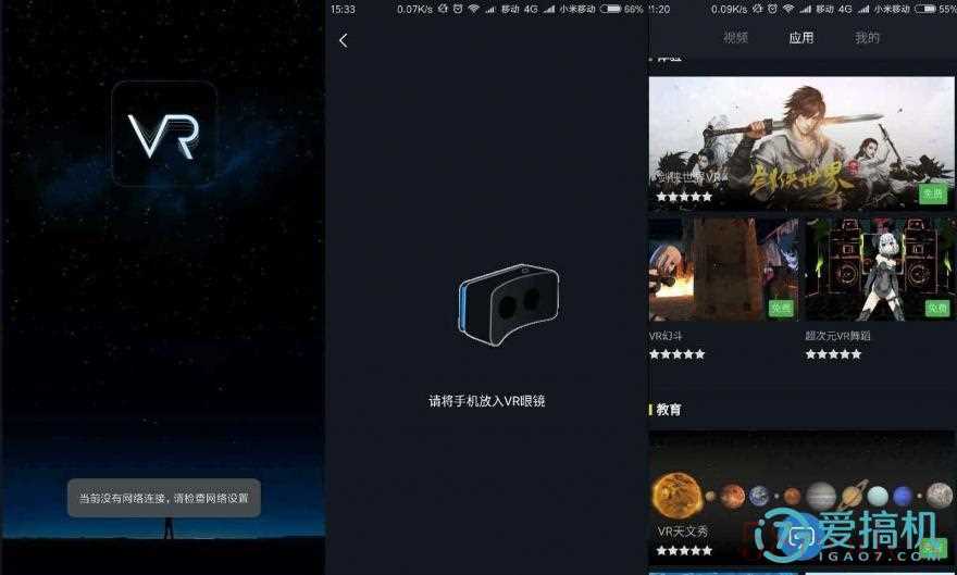 小米VR与乐视VR两个app只要安装后用wifi或流量就可直接播放了无需烦人的注册,想看什么应有尽有,从风景到动物,人物与二次元还有手游VR总有一样你喜欢。在这里重点说明一下小米VR在使用过程体验虚似现实中出会现晕车感,本人在使用两分钟左右就有些晕车感马上停止使用,这情况因人而议。