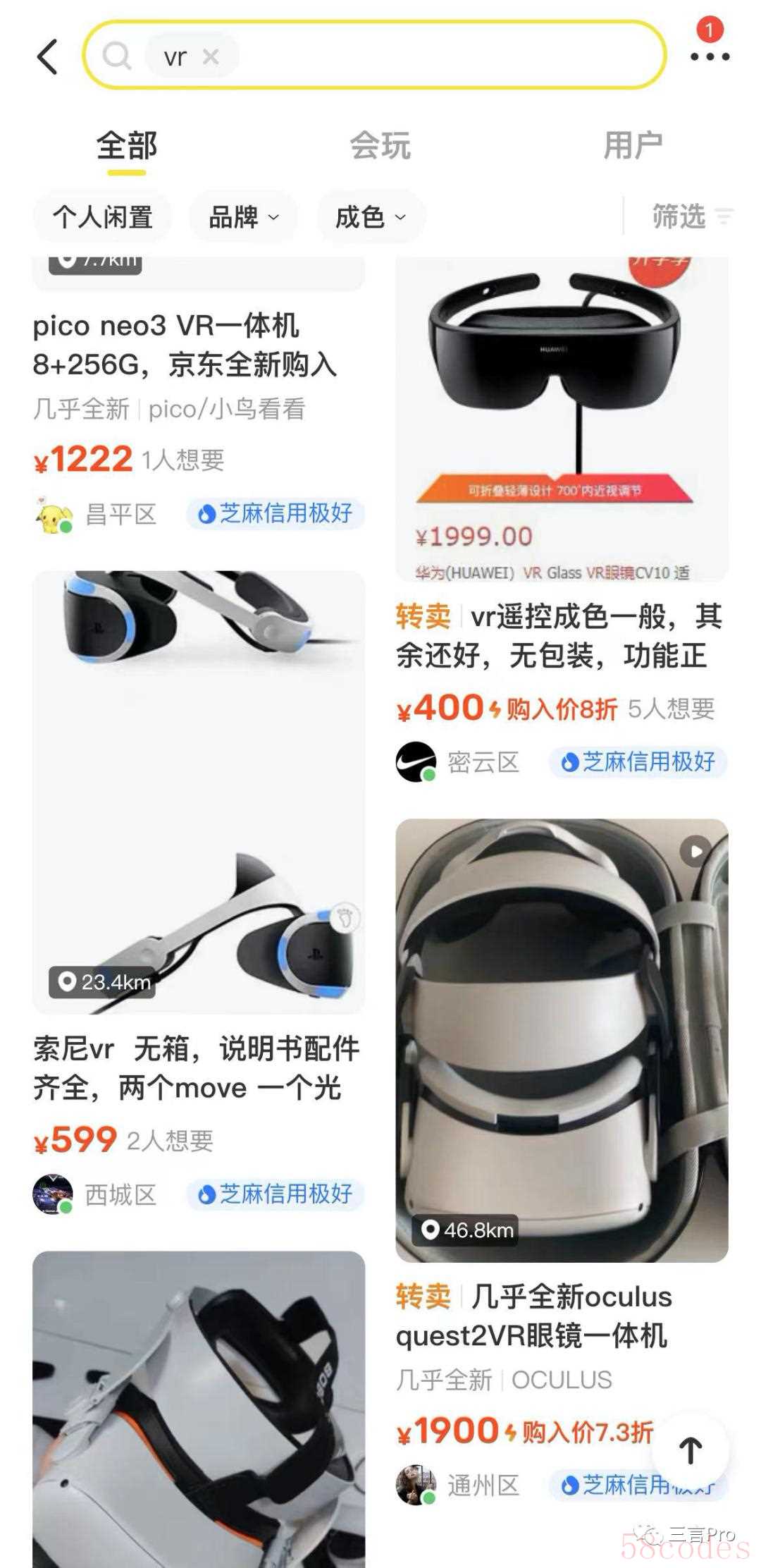 在某二手平台,有大量出售闲置AR/VR头显设备的帖子,涉及的品牌众多,大部分都是头部的一些知名品牌,比如Meta旗下的Oculus、字节旗下的PICO,还有索尼、小米等。