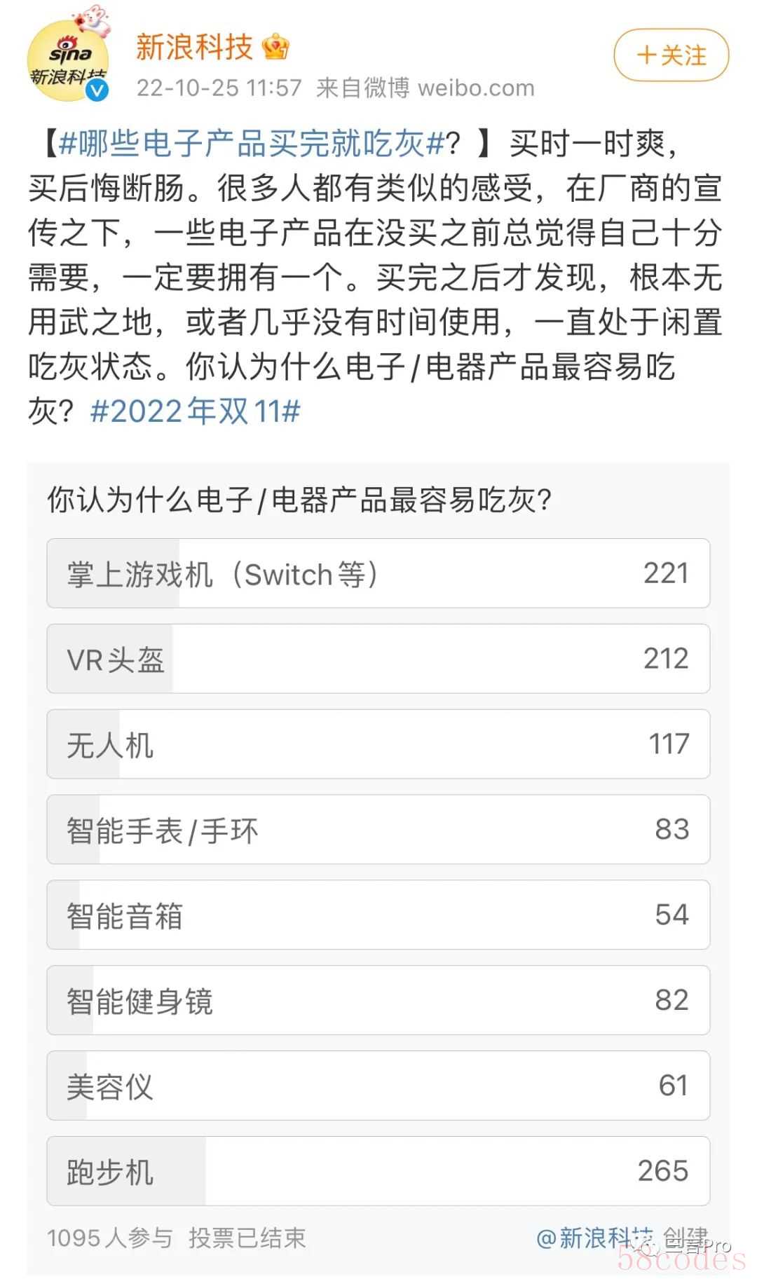 去年,新浪科技曾发起一项“最容易吃灰的电子产品”投票活动,共有1095人参与投票。